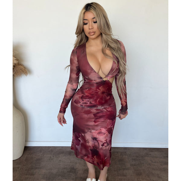 Helena Long Sleeve Midi Dress W Front Ring (Red Floaral)