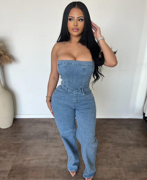 Linda Strapless Wide Leg Denim Jumpsuit (Lt Blue)