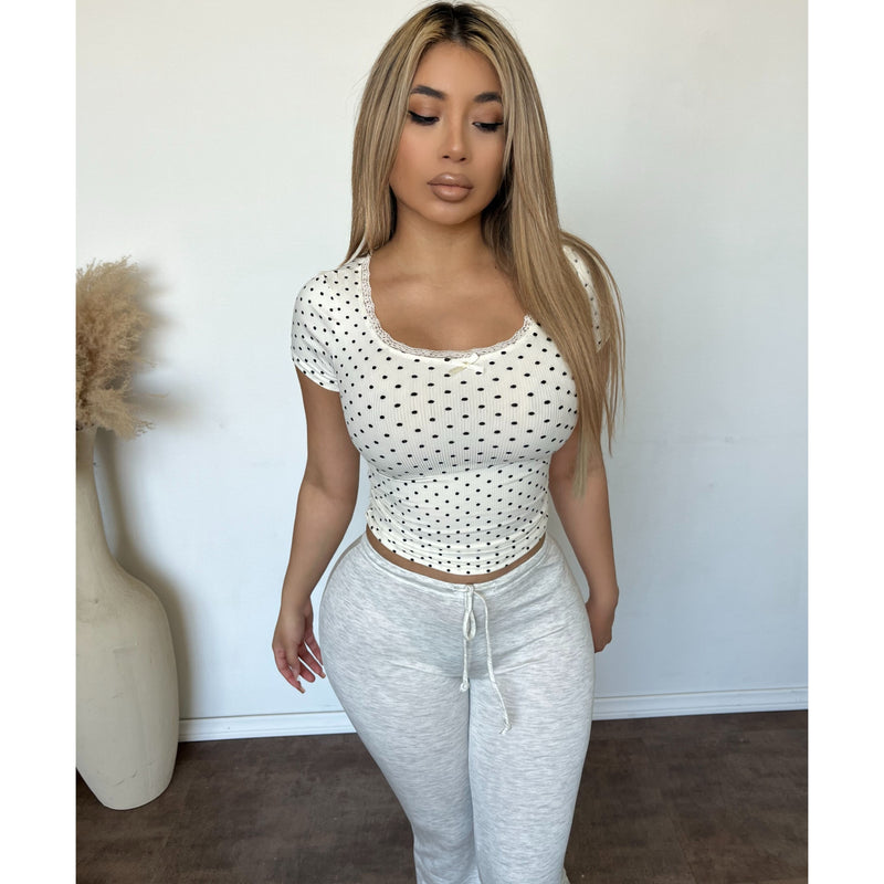 Angie Square Rib Neck Top W Lace Trim Polka Dot (Ivory/Black)