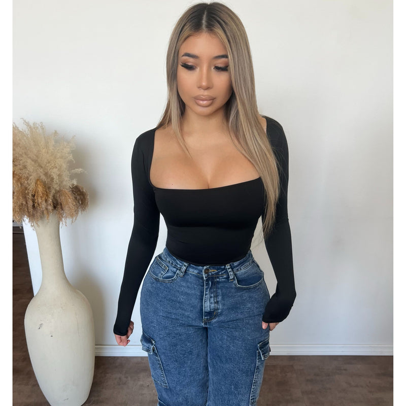 Dora Square Neck Long Sleeve Top (Black)