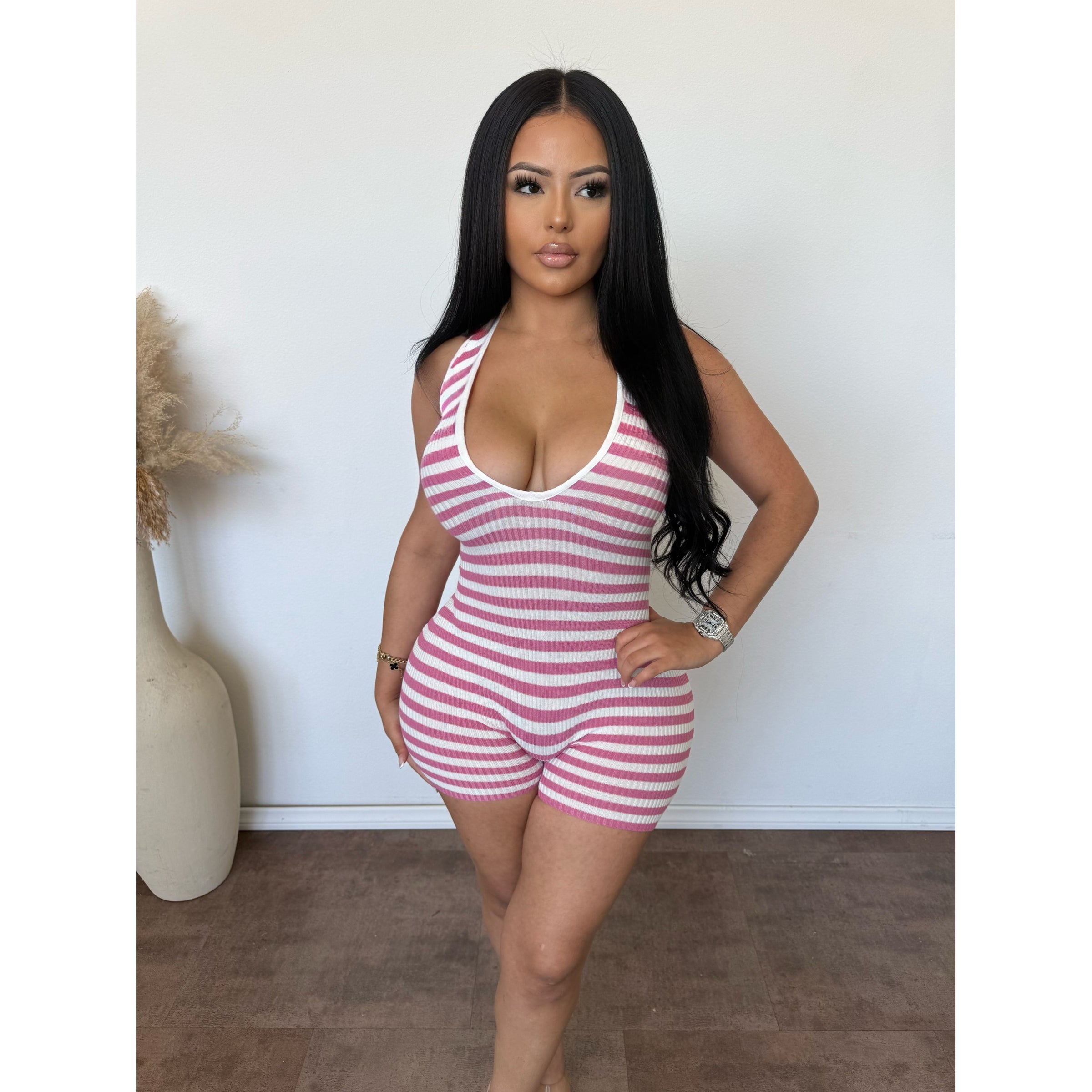 Jess Stripe Halter Neck lace Up Romper (White/Pink)