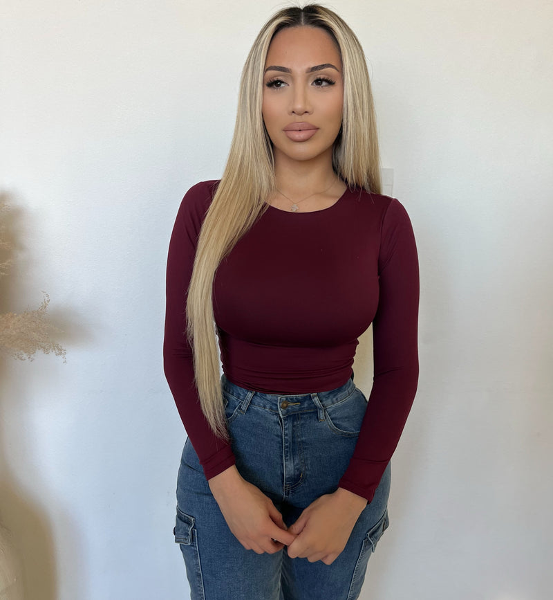 Sarah Round Neck Long Sleeve Top (Burgundy)