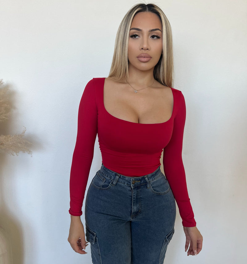 Doreen Scoop Neck Long Sleeve Top (Red)
