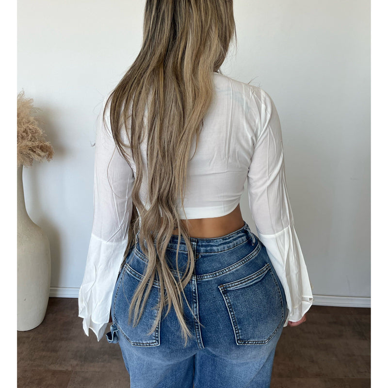 Amelia Rib Runched Long Sleeve Top (Off White)