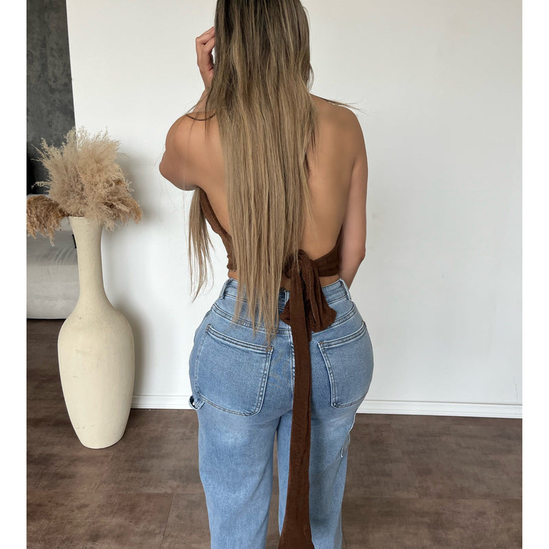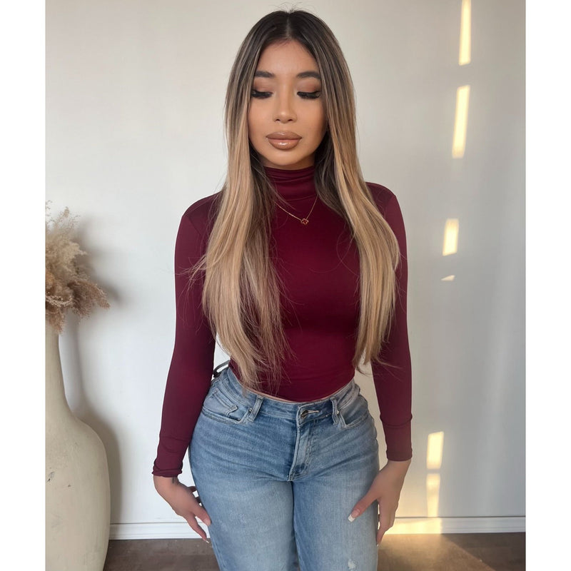 Makayla Deep V Neck Long Sleeve Top (Brownie)