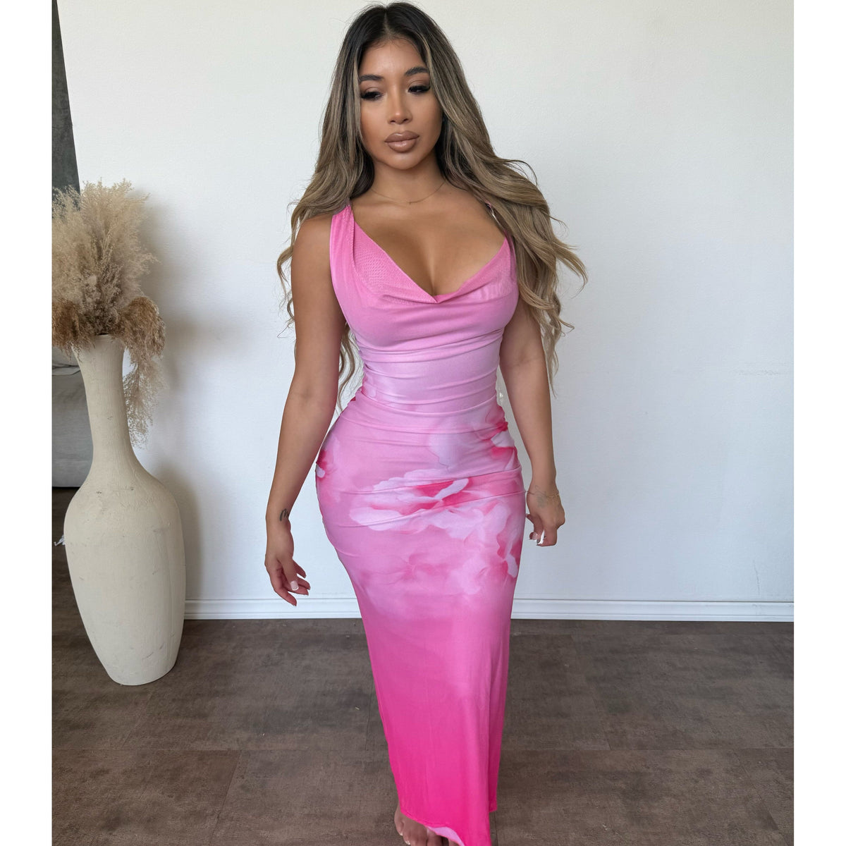 Flower Print W Metal Trim On The Shoulder Long Dress