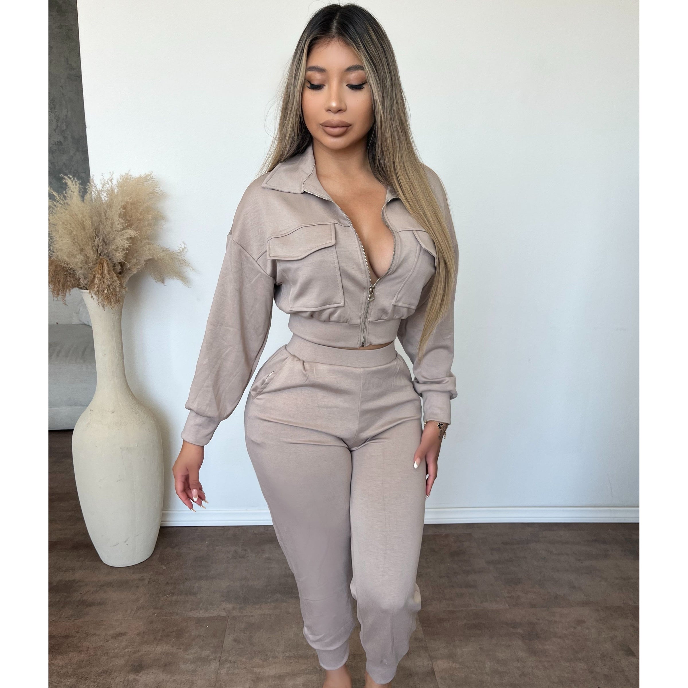 Double Soft Cropped Zip Up Jacket & Cuff Pant 2 Piece