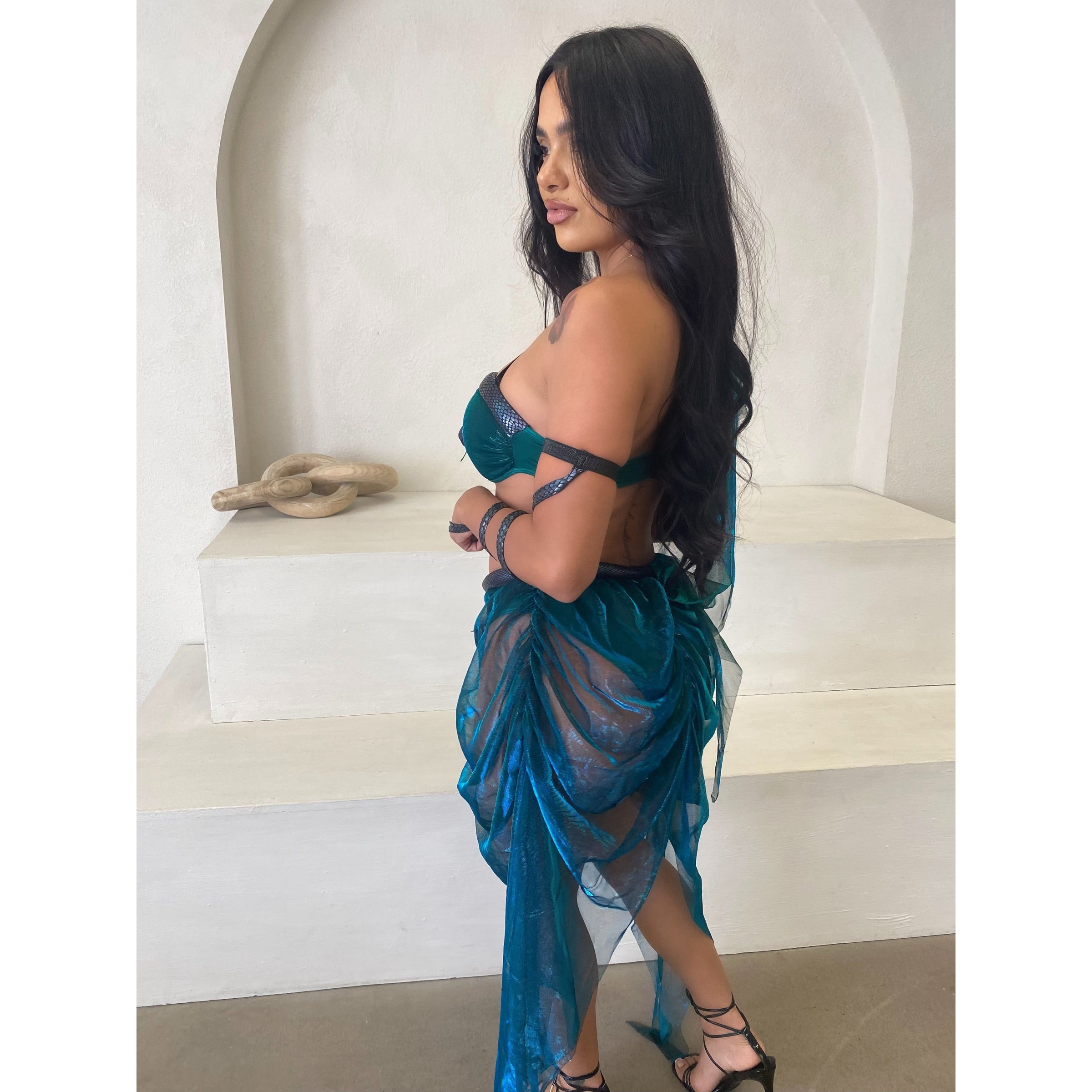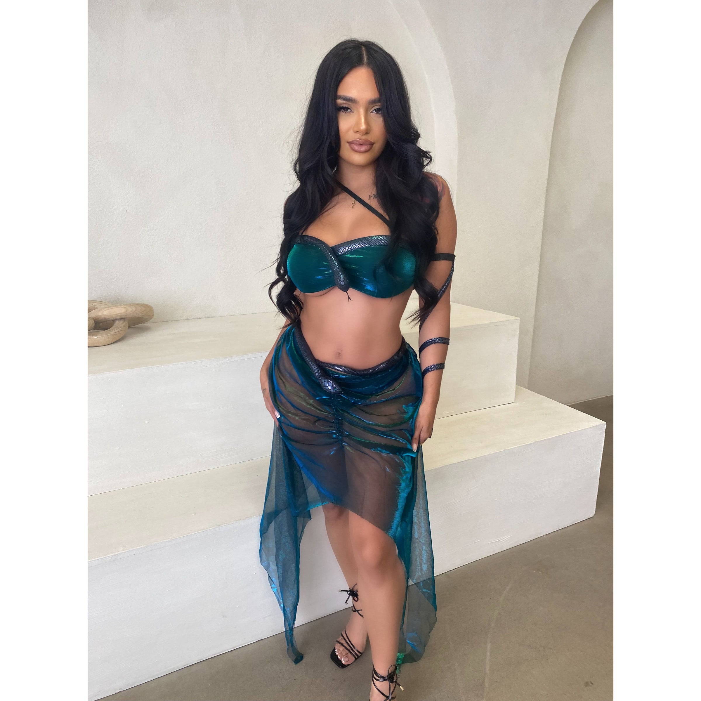 Medusa Includes Iridescent Asymmetrical bra top with stuffed snake accent skirt w built in panty 4PCS